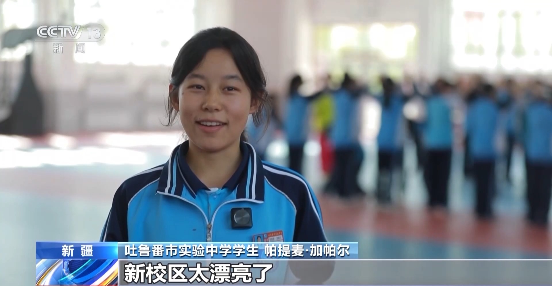 吐鲁番市实验中学学生 帕提麦·加帕尔:新校区太漂亮了,在这里我现在学习劲头儿十足,已经爱上这里的生活了。