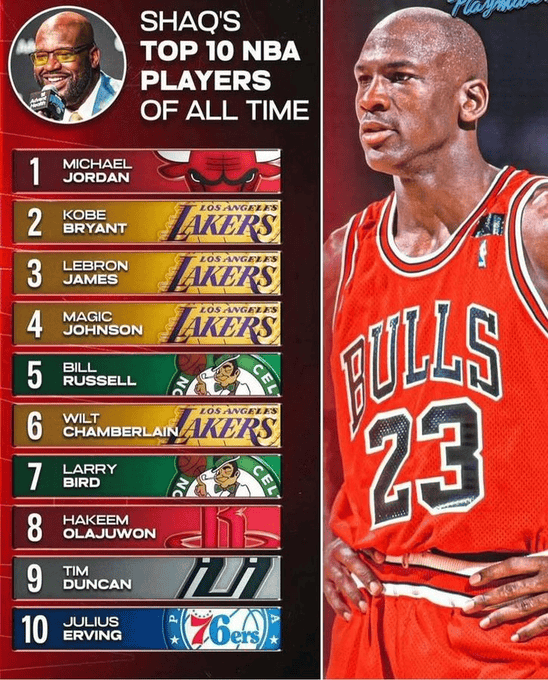 虎扑10月11日讯 今日,NBA名宿奥尼尔晒出了自己心目中的历史前十: