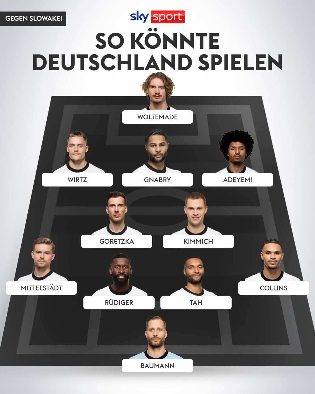 天空体育对德国对阵斯洛伐克的世预赛首发进行了预测,其中,沃尔特马德突前,基米希和格雷茨卡组成双后腰。